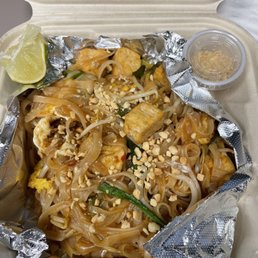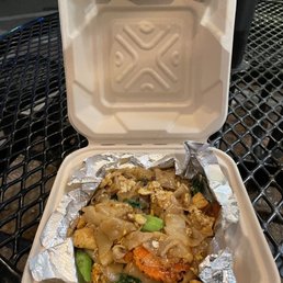 Best idea ever to try this place out. Usually food trucks don't taste as good as restaurants in my opinion but this place proved me wrong. It was actually one of the best Thai food I've had in Austin! I love how wide their noodles were and the flavoring was just perfect. Not too salty and not soggy at all like some of the comments said. Pineapple fried rice was also great. Good service, very quick to get our food. This food truck is located in a parking lot with other food trucks (next to sushi Dawa). There are a few seats. Good to go for a quick bite or if you wish to take your fur baby with you.